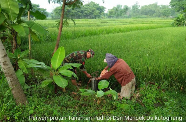 Masih di wilayah Desa Kutogirang, kegiatan pendampingan penyemprotan tanaman padi juga dilakukan Kopka Anang Rusdi di lahan seluas 6.000 meter, milik Tarjo, Poktan Tani Mendek, Dusun Mendek.