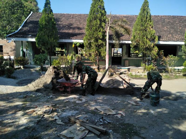 Sesuai pengamatan di lapangan, personel TNI dari SSK Kodim 0815 bersama-sama masyarakat secara bergotongroyong mengerjakan renovasi ruang kelas dan kamar mandi SDN Kebontunggul. Tampak suasana penuh kebersamaan dan benar-benar manunggal antara TNI dan rakyat. (Jayak)