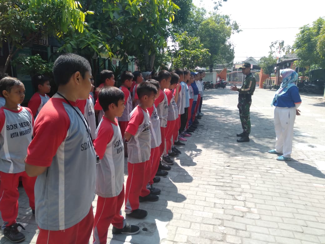 Mojokerto, – Puluhan siswa-siswi SDN Meri 2 Kota Mojokerto, menerima pelatihan PBB (Peraturan Baris Berbaris) dari Bati Tuud Koramil 0815/19 Magersari Kodim 0815 Mojokerto, Peltu Matorin dan Babinsa Kelurahan Meri, Serka Abas Tirtana, Kamis (12/09/2019).
