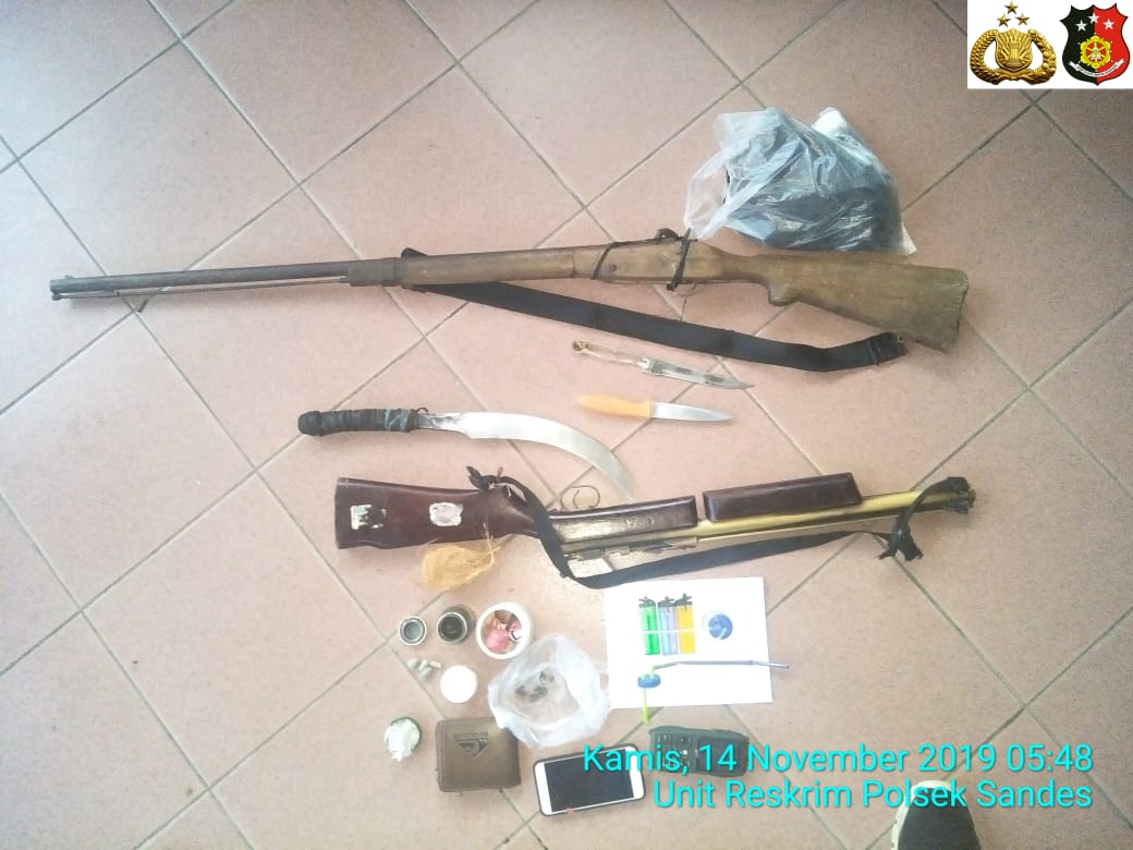 Adapun Barang bukti yang di temukan berupa1 pucuk senpi rakitan laras panjang jenis kecepek,1pucuk senapan angin beserta 1 kantong plastik kecil peluru senapan angin,1bilah celurit,1 botol bubuk mesiu kip,4 buah tima dan serabut kelapa,1buah bong 2 buah pirek kaca 4 buah korek api 2 bilah pisau turut diamankan ke Mapolsek.( Sadiman)