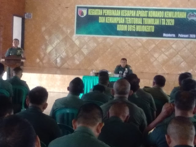 Mojokerto – Pembinaan kesiapan aparat kewilayahan dan kemampuan teritorial yang di selenggarakan oleh Kodim 0815/Mojokerto di pendopo Griya Paramitra Mojokerto pada Selasa 11 februari 2020. merupakan upaya untuk meningkatkan kemampuan Sumber Daya Manusia yang handal dan mumpuni, dalam hal ini prajurit Kodim 0815/Mojokerto sebagai satuan komando kewilayahan dalam pemberdayaan wilayah pertahanan darat.