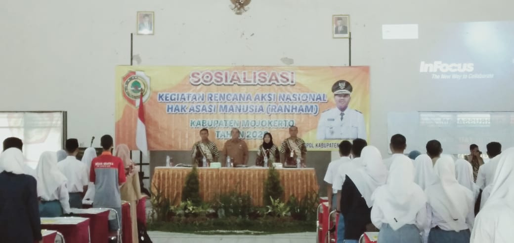 Mojokerto Dalam Sosialisasi RANHAM* Mojokerto, – Perwira Seksi Teritorial (Pasiter) Kodim 0815/Mojokerto Kapten Inf Herman Hidayat hadir dan berpartisipasi aktif dalam Sosialisasi Rencana Aksi Nasional Hak Azasi Manusia (RANHAM) Tahun 2020 Kabupaten Mojokerto, Senin (24/02/2020). Kegiatan yang diselenggarakan Bakesbangpol Kabupaten Mojokerto, berlangsung di Gedung KORPRI Jalan Raya Jabon Desa Gayaman Kecamatan Mojoanyar Kabupaten Mojokerto, mengusung tema “Penguatan Nasionalisme Melalui Nilai-Nilai Luhur Pancasila Dalam Menangkal Radikalisme”. Peserta sosialisasi terdiri dari para pelajar dari 9 SMAN/SMKN se-Kabupaten Mojokerto beserta guru pendamping, yakni SMAN Ngoro, SMAN Pacet, SMAN Trawas, SMAN Mojosari, SMAN Bangsal, SMKN Dlanggu, SMAN Kutorejo, SMKN Pungging dan SMAN Gondang. Pada sosialisasi tersebut, seratusan lebih pelajar SMAN/SMKN menerima sejumlah materi seputar Penguatan Nasionalisme Melalui Nilai-Nilai Luhur Pancasila Dalam Menangkal Radikalisme, yang disampaikan Kepala Bakesbangpol Kabupaten Mojokerto Drs. Yo’ie Afrida S, SH, M.Si., Sekretaris MUI Kabupaten Mojokerto KH. Imam Ghozali, S.Pd.I., Dosen Universitas Mayjen Sungkono Mojokerto Ragil Mayasari, S.Pd, M.Sc., dan Dosen Universitas Widya Mandala Surabaya Dr. Aksania. Sementara Pasiter Kodim 0815/Mojokerto Kapten Inf Herman Hidayat, yang hadir mewakili Dandim 0815/Mojokerto, Letkol Inf Dwi Mawan Sutanto, SH., menyampaikan tentang materi seputar Ketahanan Nasional dan Pancasila. “Pada hakekatnya Ketahanan Nasional adalah kemampuan dan ketangguhan suatu bangsa untuk menjamin kelangsungan hidupnya menuju kejayaan bangsa dan negara,” ungkap Pasiter. Ditegaskan Pasiter, dijadikannya Pancasila sebagai Ideologi Negara sudah melalui berbagai proses dengan pertimbangan yang matang dari para Pendiri Bangsa beserta segenap tokoh. Pancasila sebagai isi jiwa Bangsa Indonesia yang digali dari kearifan lokal nusantara merupakan identitas dan pemadatan nilai serta norma yang ada di masyarakat. “Pancasila juga merupakan perjanjian luhur yang telah disepakati wakil-wakil rakyat sebagai pedoman/penuntun arah dalam mewujudkan cita-cita bangsa,” tegasnya. Kapten Inf Herman Hidayat juga berpesan kepada para siswa untuk menghindari hoaks dan ujaran kebencian (hate speech) karena dampak negatifnya sangat luar biasa, diantaranya melunturkan kepercayaan masyarakat terhadap pemerintah dan aparat, memunculkan sikap apatis, intolera n terhadap perbedaan bahkan berpotensi memicu terjadinya konflik di masyarakat.