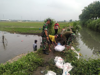 Mojokerto,- Personel Pos Ramil Mojoanyar Kodim 0815/Mojokerto bersama Dinas Pengairan dan warga yang tergabung dalam Poktan Tani Temen -1, melakukan pembenahan tanggul sungai di wilayah RT 04 RW 02 Dusun Jogodayoh, Desa Jabon, Kecamatan Mojoanyar Kabupaten Mojokerto, Jawa Timur, Rabu (26/02/2020).