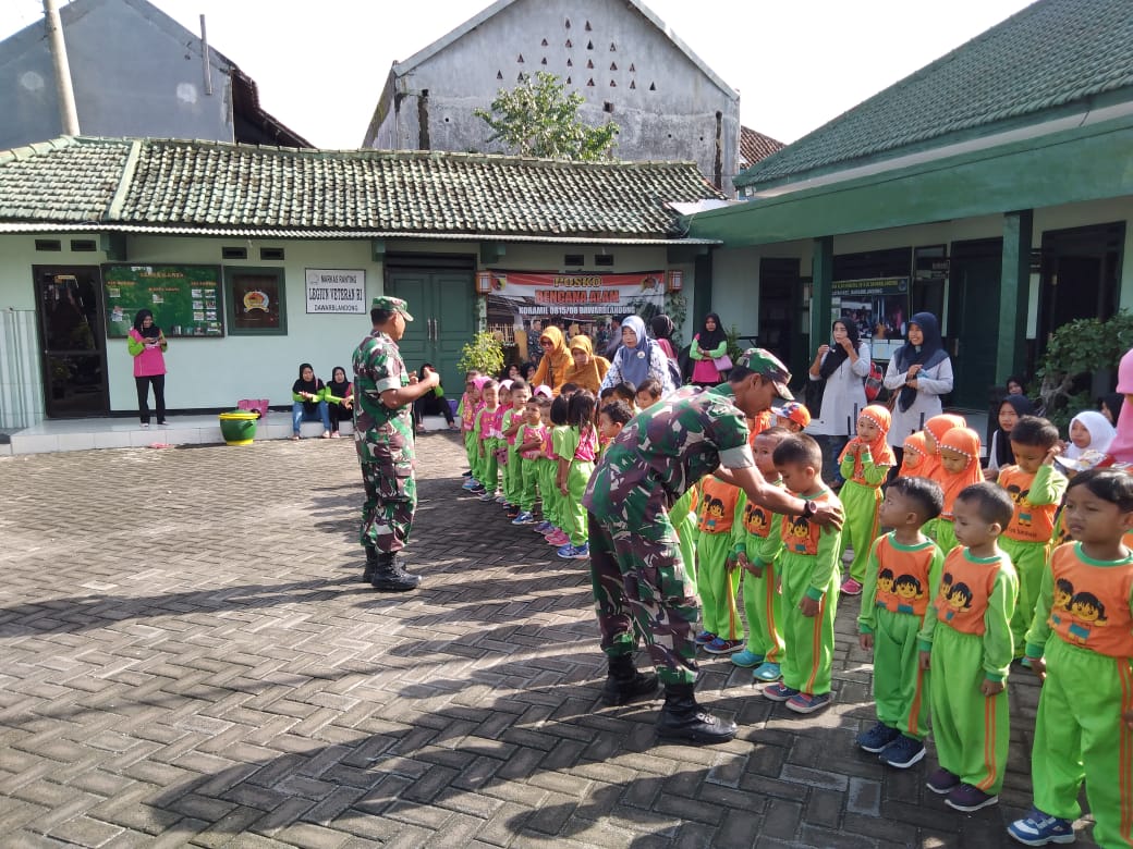 Dihadapan puluhan siswa Kelompok Bermain (KB) Hasanuddin Desa Pulorejo dan KB Tunas Jaya Desa Cendoro, Serma Suwono menjelaskan tentang Profesi Tentara Nasional Indonesia (TNI). Peran dan tugas TNI di Satuan Komando Kewilayahan setingkat Koramil, tak luput dari penjelasan Bati Tuud.