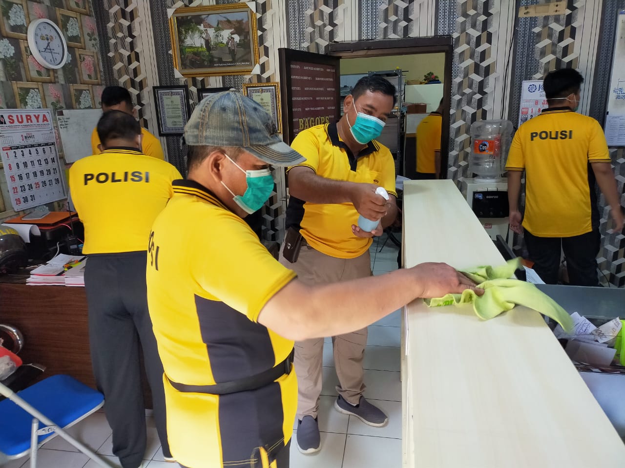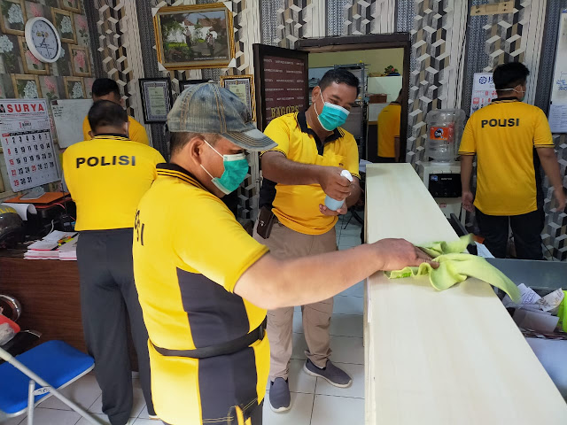 Sebelum pemasangan Hand Sanitizer, terlebih dahulu dilakukan korve kerja bahkti membersihkan ruang kerja masing-masing dengan menggunakan peralatan tradisional, menyemprot disinfektan di lantai, dinding, pintu, meja, kursi/tempat duduk yang memiliki resiko penularan virus corona.