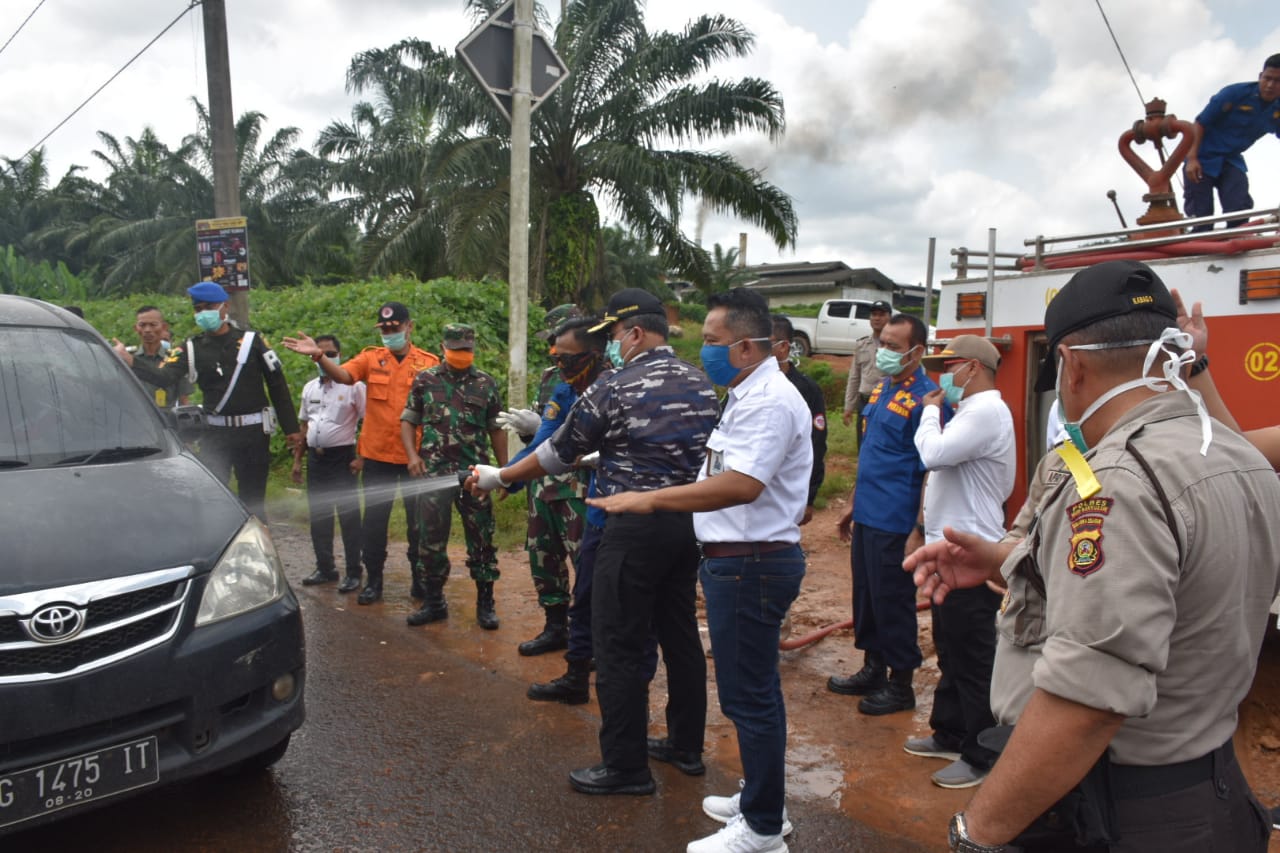 Polres Musi Banyuasin bersinergi bersama Pemkab Muba dan Kodim 0401 Muba melakukan penyemprotan disinfektan dibeberapa lokasi pintu masuk ke Kabupaten Musi Banyuasin, Selasa(31/3/2020)