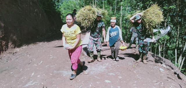 Melihat hal tersebut, Prada firdaus bersama prada arafah anggota satgas TMMD dari Yonif 527/BY yang tergabung sebagai anggota Satgas TMMD Ke -107 Kodim 0823/Situbondo langsung cekatan dan membantu ibu-ibu tersebut untuk membawakan rumput sambil bercakap santai di jalan itu.