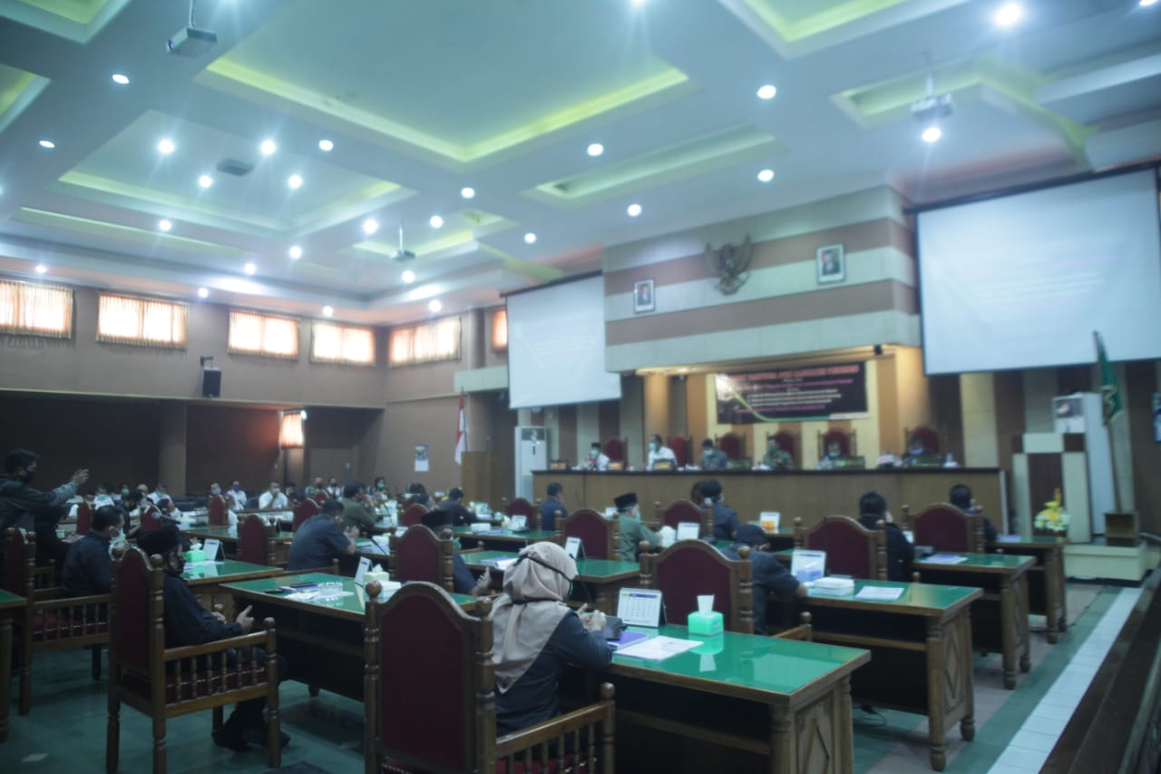 Ponorogo – DPRD Kabupaten Ponorogo menggelar rapat paripurna jawaban eksekutif atas 3 raperda, penyampaian Laporan Keterangan Pertanggung Jawaban APBD tahun anggaran 2019 oleh Bupati Ponorogo dan pembentukan Pansus atas 3 Raperda tersebut, Rabu (15/4/2020) di Aula Kantor DPRD Ponorogo Lantai 3.