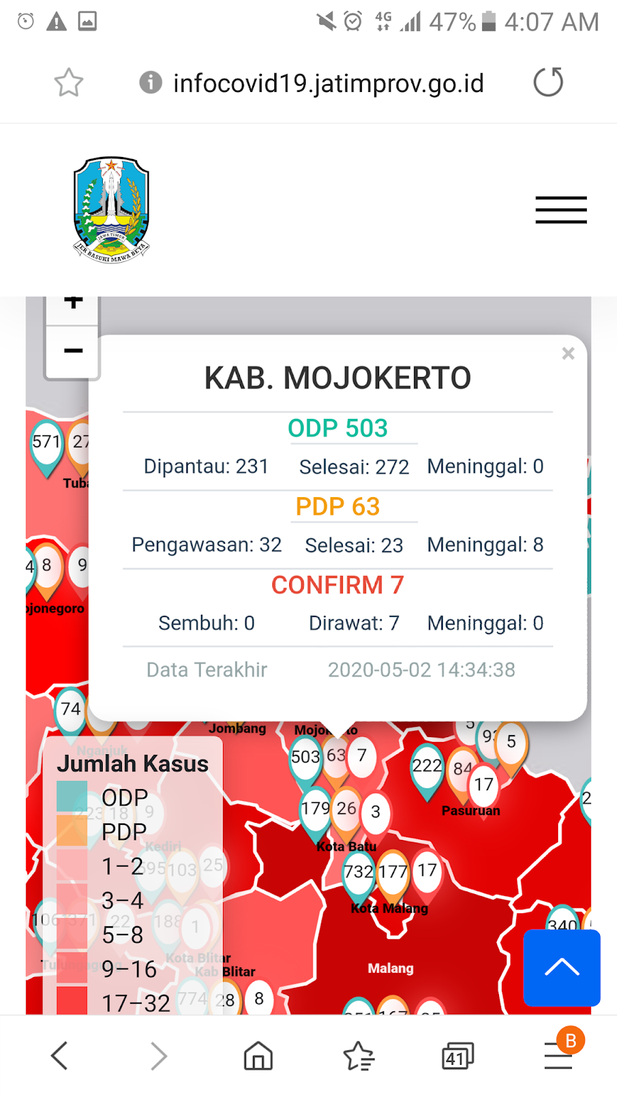 Mojokerto – Seorang ibu di Kecamatan Sooko, Kabupaten Mojokerto, positif terinfeksi virus corona (COVID-19). Suaminya diketahui bekerja sebagai pegawai Kemenag, Kabupaten Mojokerto yang mengikuti pelatihan petugas haji di asrama haji Sukolilo, Surabaya beberapa waktu lalu.