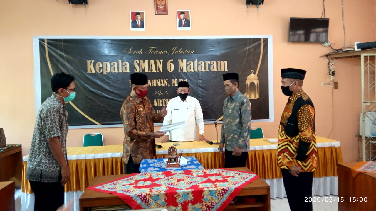Serah terima jabatan tersebut dilangsungkan di ruang guru dengan dihadiri oleh staf khusus gubernur, ketua komite, pengawas, beberapa perwakilan staf pengajar, staf TU dan disaksikan oleh bapak/ibu guru di rumah masing-masing melalui live facebook SMA Negeri 6 Mataram, Jumat siang (15/5/20).