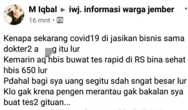 Pemilik akun FB M Iqbal dilaporkan ke polisi karena mem-posting kalimat yang menyebut COVID-19 jadi ajang bisnis dokter. Narasi itu di-posting di grup FB bernama iwj, informasi warga jember.
