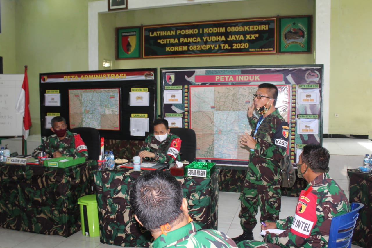 Kediri – Kepala seksi operasional Korem 082/ CPYJ Mayor Inf Topan Angker , meninjau Latihan Posko I TA 2020 penanggulangan bencana di Kodim 0809/ Kediri, kamis ( 11/06/2020)