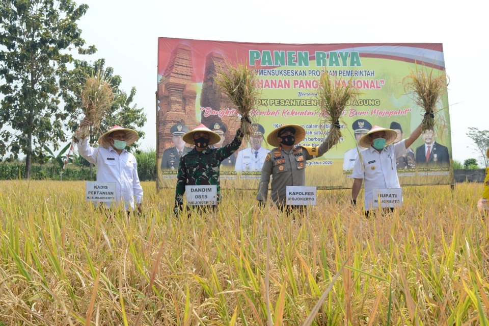 Mojokerto, – Dandim 0815/Mojokerto Letkol Inf Dwi Mawan Sutanto, SH., Bupati Mojokerto H. Pungkasiadi, SH., dan Kapolres Mojokerto AKBP Dony Alexander, S.IK, MH., melaksanakan panen raya bersama Anggota Komisi XI DPR RI, Muhammad Sarmuji, SE., M.Si., Wakil Ketua DPRD Provinsi Jatim, Sehat Tua P. Simanjutak, SH., MH., dan Pengasuh Ponpes Segoro Agung Trowulan, KH. Bimo Agus Sunarno (Gus Bimo), di Area Persawahan yang dikelola Ponpes Segoro Agung, Dusun Kepiting, Desa Temon, Kecamatan Trowulan Kabupaten Mojokerto, Jawa Timur, Rabu (05/08/2020).