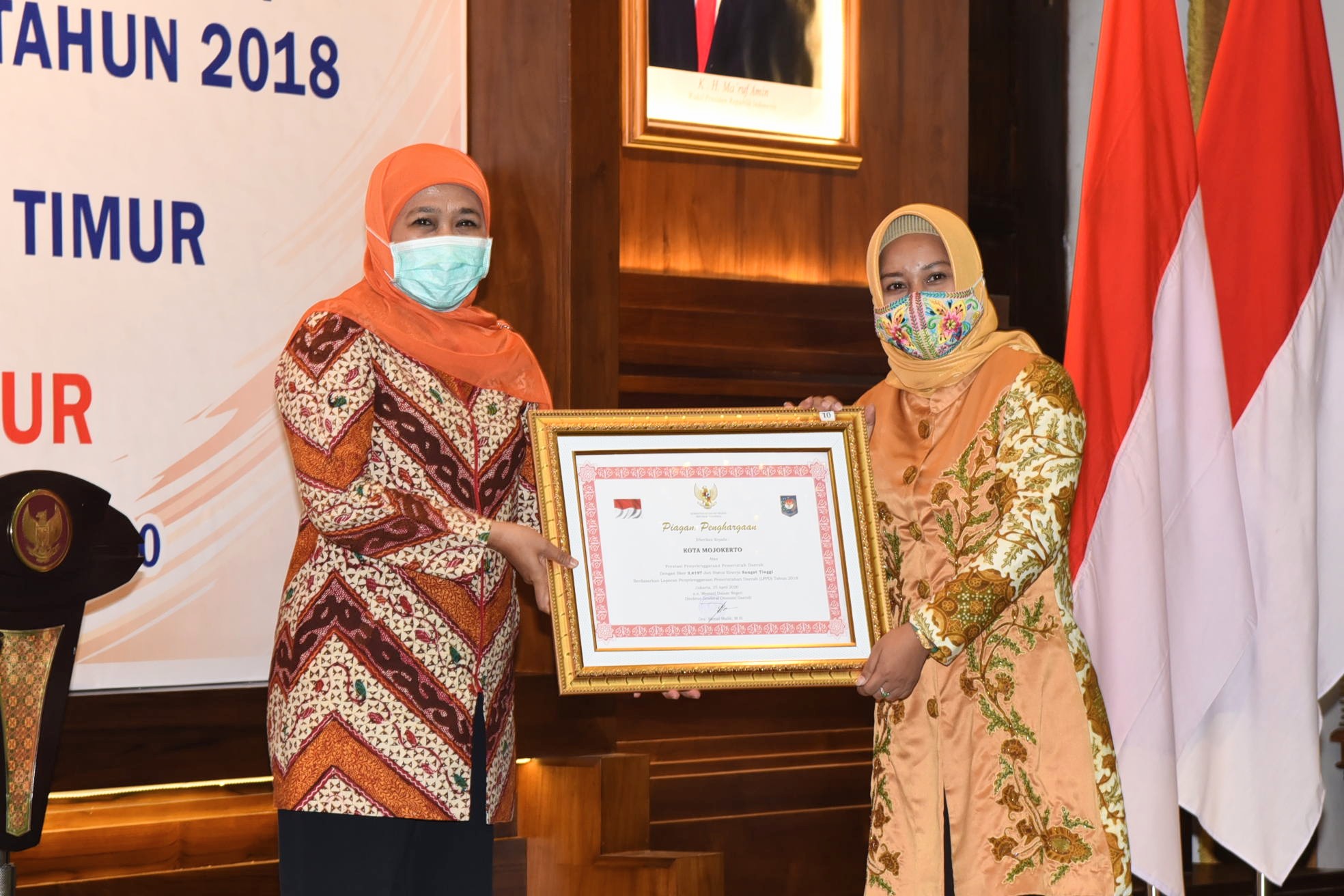 Penghargaan tersebut, diserahkan langsung oleh Gubernur Jawa Timur Khofifah Indar Parawansa kepada Wali Kota Mojokerto Ika Puspitasari di Gedung Negara Grahadi, Surabaya, hari ini (16/10). Melalui penghargaan ini, Kota Mojokerto menduduki peringkat ke dua kategori kota se-Jawa Timur.