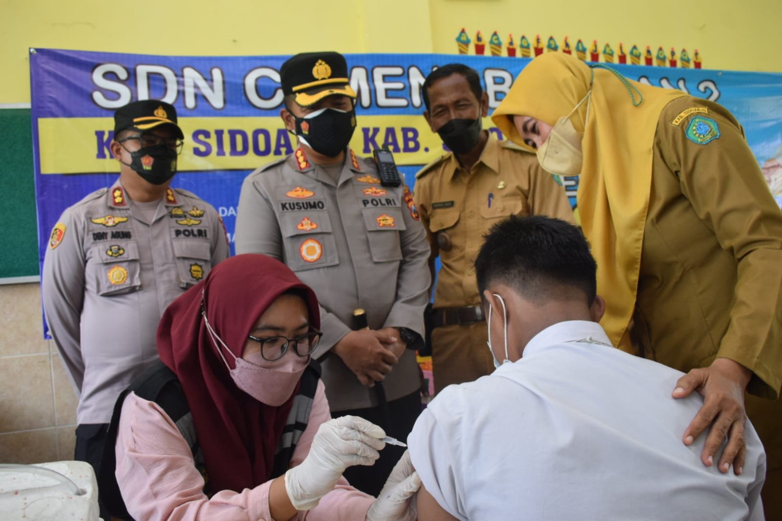 SIDOARJO – Akhir Januari 2022 vaksinasi anak usia 6 sampai 11 tahun ditarget telah mencapai 70 persen. Polresta Sidoarjo bersama TNI, Dinas Kesehatan dan instansi terkait terus berupaya menggencarkan vaksinasi ke sekolah-sekolah.