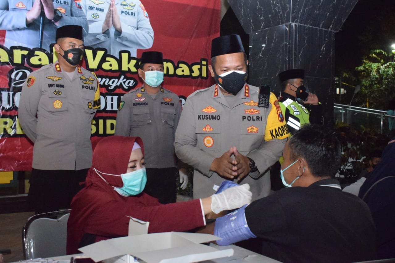 Untuk memastikan jalannya vaksinasi bertempat di halaman Masjid Agung Sidoarjo berjalan lancar, Kapolresta Sidoarjo Kombes Pol. Kusumo Wahyu Bintoro bersama Wakapolresta Sidoarjo AKBP Deny Agung Andriana dan pejabat utama Polresta Sidoarjo, ikut memantau proses vaksinasi tersebut.