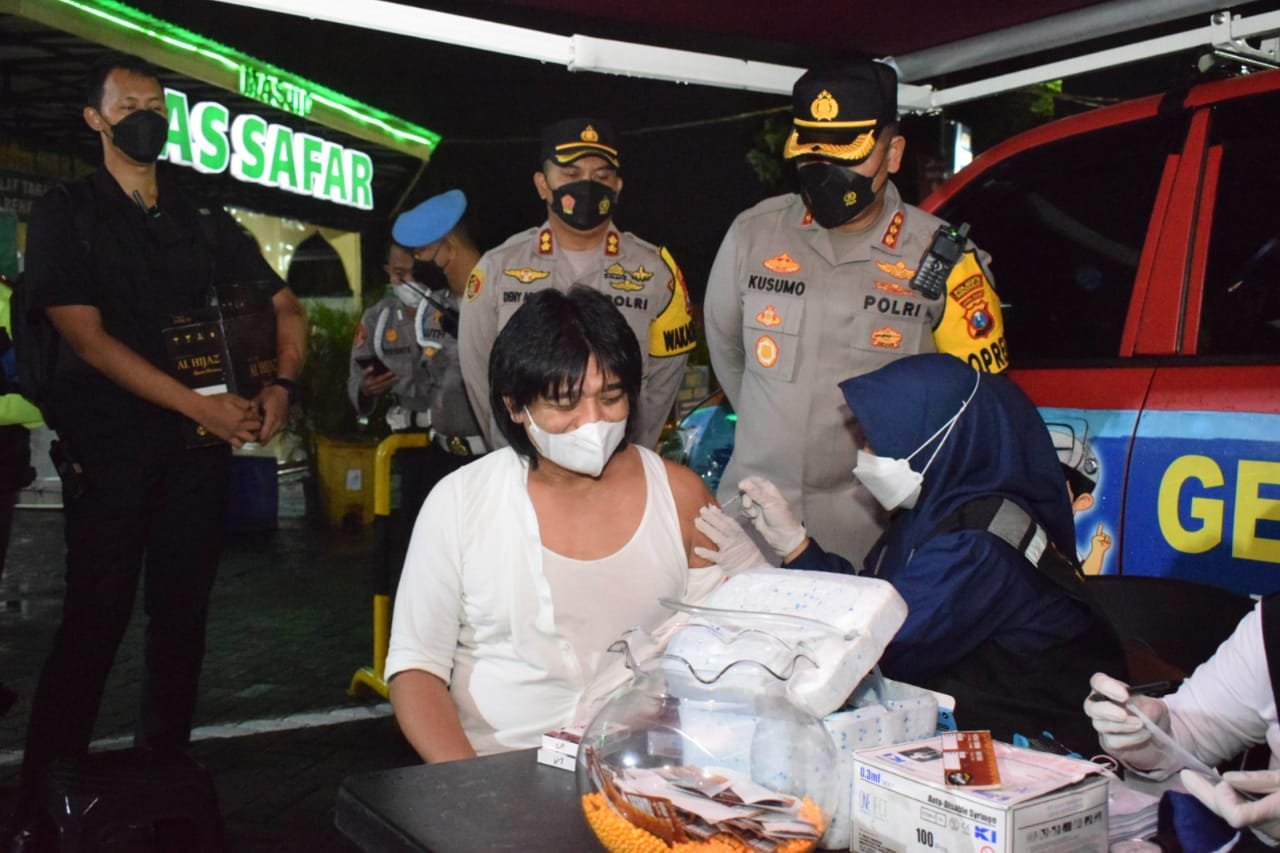 Di jalur tol Sidoarjo-Surabaya, tepatnya di rest area 753, Selasa (19/4/2022) mulai petang sampai malam hari, Polresta Sidoarjo bersama Pemkab Sidoarjo, Dinas Perhubungan dan Jasa Marga membuka gerai vaksinasi mobile di lokasi.