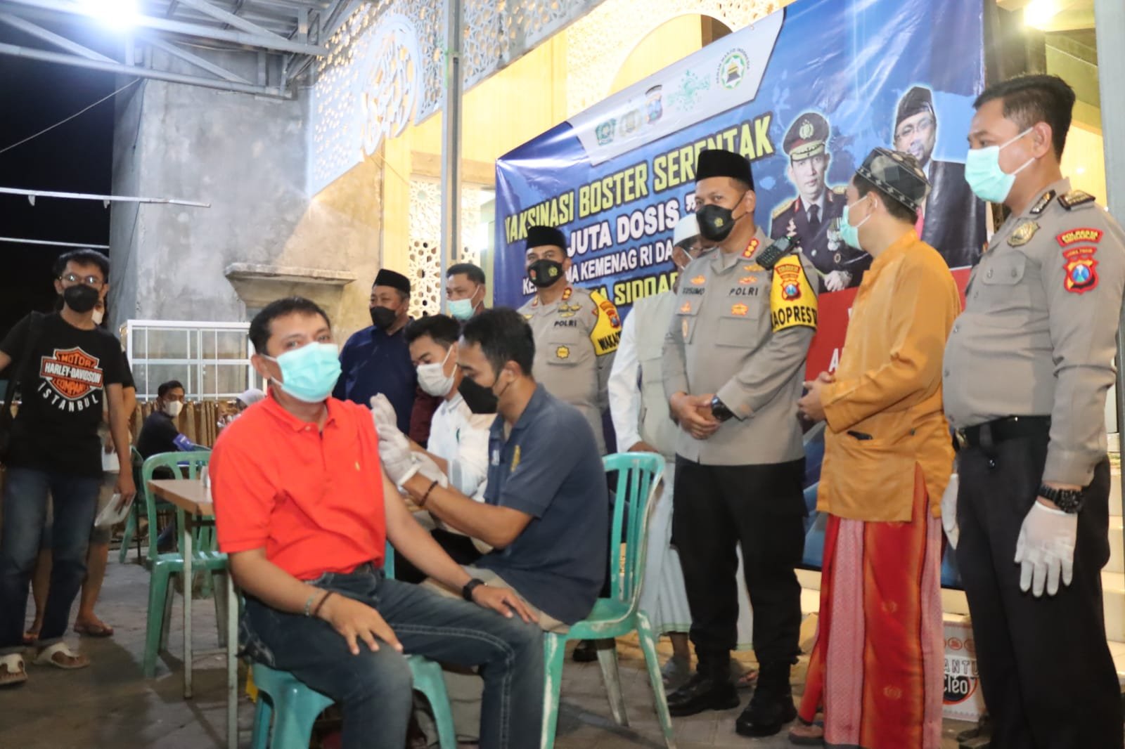 Begitu selesai Shalat Tarawih, gerai vaksinasi booster Polresta Sidoarjo di halaman Masjid At Taubah, langsung diserbu masyarakat. Warga dari kalangan remaja hingga orang lanjut usia, berduyun-duyun mendatangi tempat vaksinasi.
