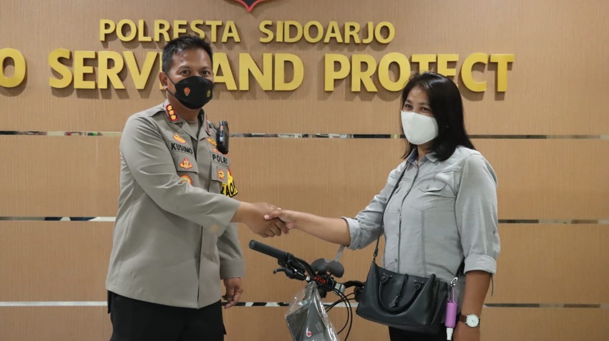 Kapolresta Sidoarjo Kombes Pol. Kusumo Wahyu Bintoro, usai menyerahkan hadiah satu unit sepeda MTB Polygon kepada Farida di Mapolresta Sidoarjo, Jumat (29/4/2022), mengucapkan selamat kepada masyarakat yang mendapatkan undian tersebut. Dengan upaya semacam ini, diharapkan dapat mengundang animo masyarakat untuk melakukan vaksinasi, khususnya vaksin booster.(sgi/ldy/mg)