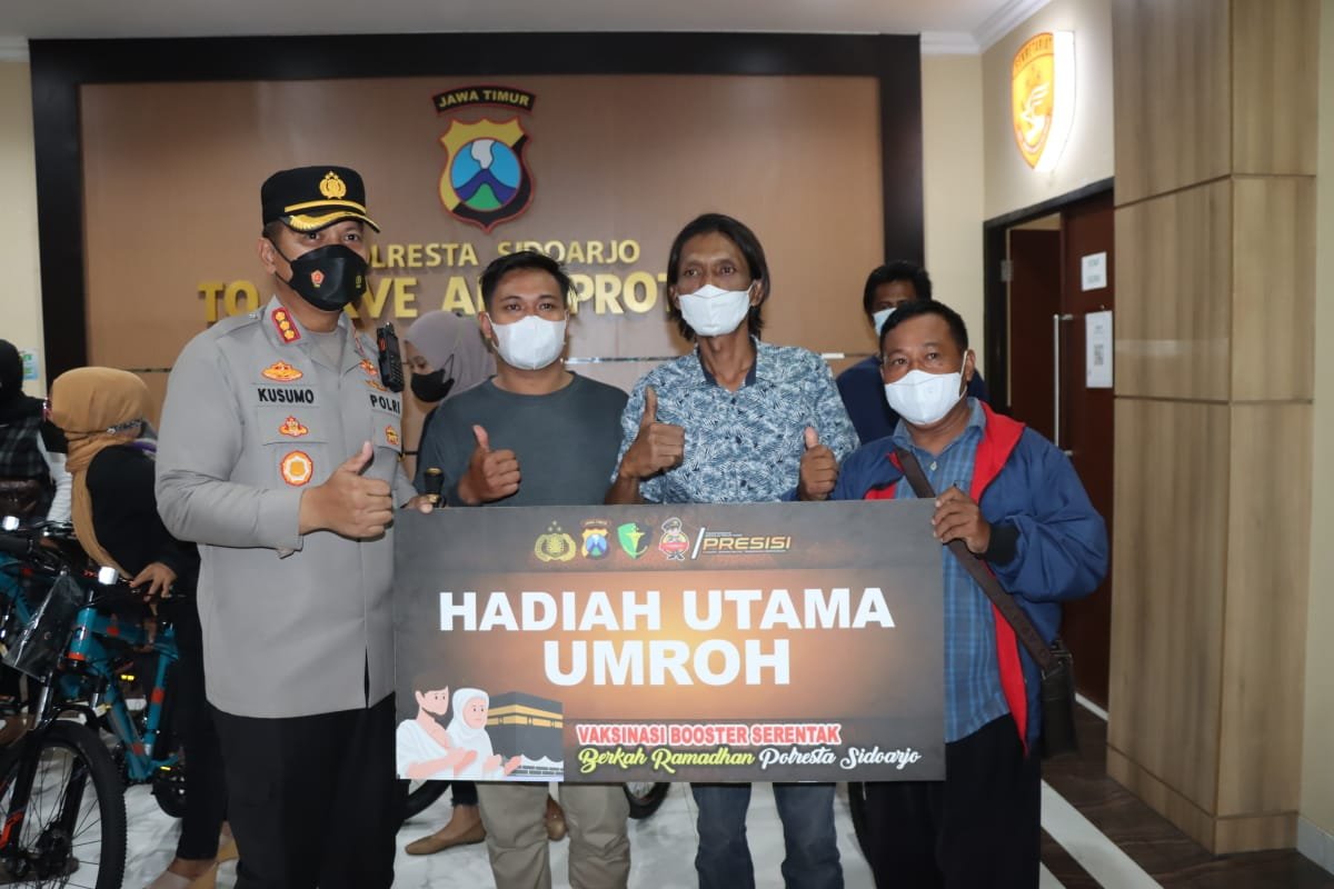 SIDOARJO – Selama Ramadhan 1443 Hijriah Polresta Sidoarjo mengadakan program gebyar vaksinasi berhadiah utama Umroh dan sepuluh sepeda MTB. Kemarin (30/4/2022), juga sudah dilakukan pengundian langsung oleh Kapolresta Sidoarjo.