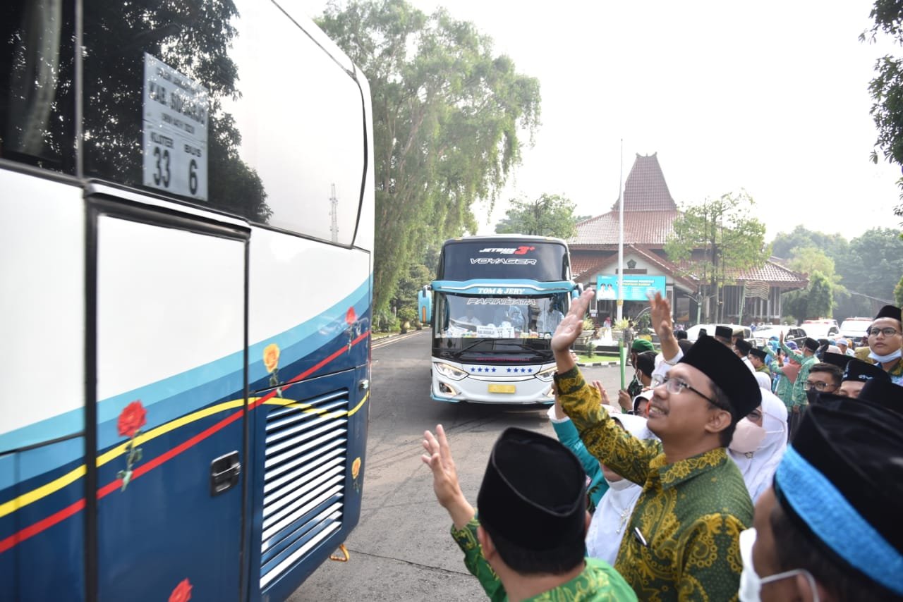 SIDOARJO,majalahglobal.com – Kelompok Terbang/Kloter 32 dan 33 menjadi Kloter terakhir Calon Jamaah Haji/CJH Asal Sidoarjo yang diberangkatkan Bupati Sidoarjo H. Ahmad Muhdlor S.IP. Jumlahnya 738 CJH. 446 CJH dari Kloter 32 dan 292 CJH dari Kloter 33. Pagi tadi, Senin, (27/6) dari pendopo Delta Wibawa Sidoarjo, para tamu Allah SWT itu diberangkatkan menuju embarkasi Surabaya sebelum menuju Mekah. Ada 15 bis yang dilepas keberangkatannya oleh bupati Sidoarjo yang akrab dipanggil Gus Muhdlor itu. Dalam pelepasan CJH Sidoarjo tersebut juga dihadiri Ketua DPRD Sidoarjo H. Usman dan Kepala Kantor Kemenag Kabupaten Sidoarjo Moh. Arwani.