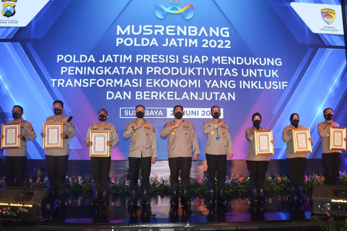 Dalam Musrenbang bertema “Polda Jatim Presisi Siap Mendukung Peningkatan Produktifitas Untuk Transformasi Ekonomi yang Inklusif dan Berkelanjutan” tersebut, diberikan penghargaan kepada satuan kerja (satker) jajaran Polda Jatim serta kategori individu atau Kabag Perencanaan terbaik.