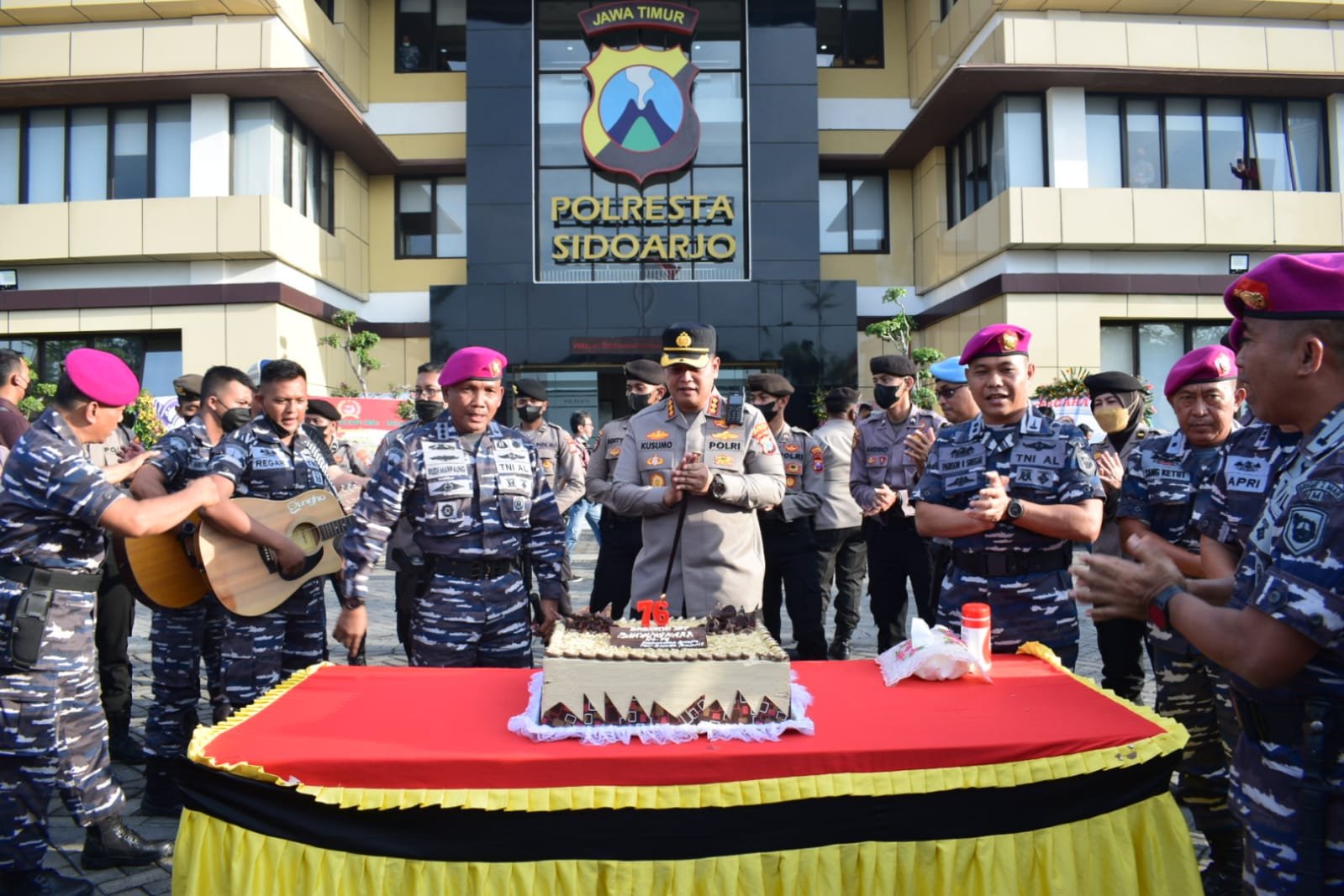 Diawali Lanudal Juanda, dipimpin Danlanudal Juanda Kolonel Heru Prasetyo bersama pejabat utama datang dengan membawakan kue tart dan melantunkan selamat ulang tahun. Menambah meriah suasana siang di depan lobi Mapolresta Sidoarjo.