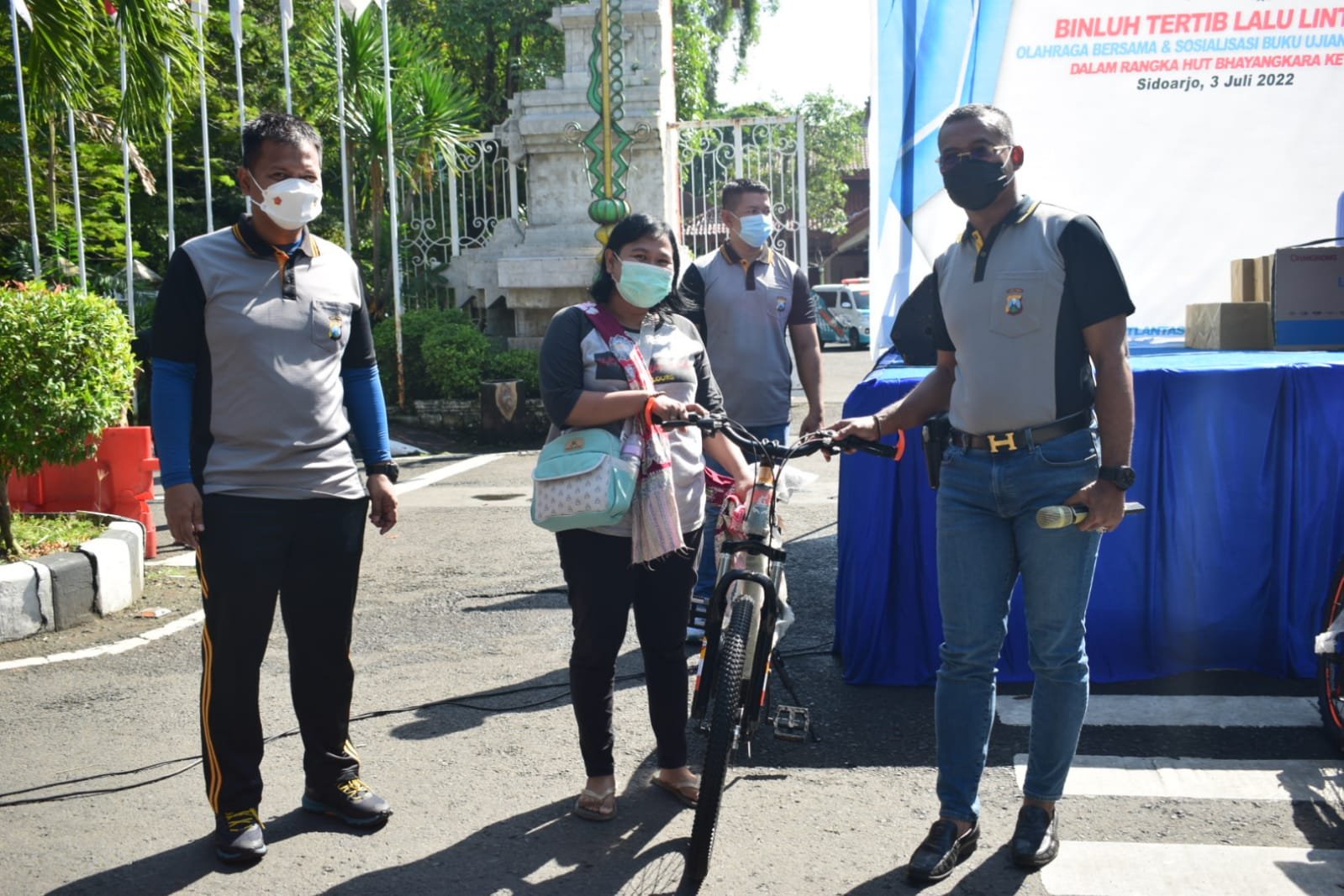Kegiatan tersebut berlangsung Minggu (3/7/2022) di Paseban Alun-alun Sidoarjo. Sambil mengedukasi masyarakat tentang peraturan tertib lalu lintas, sosialisasi buku ujian teori SIM, polisi juga mengajak masyarakat olahraga bersama.