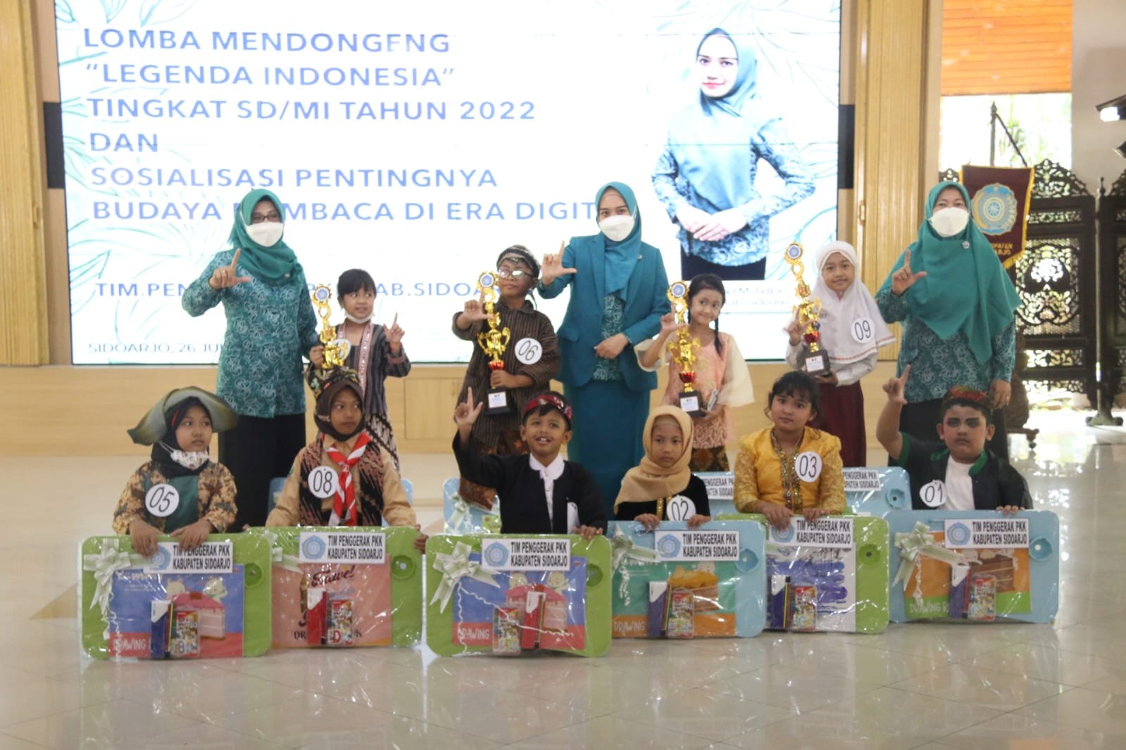 SIDOARJO,majalahglobal.com – Menjadi salah satu program untuk menggalakkan literasi bagi penerus bangsa di Kabupaten Sidoarjo, TP.PKK Kabupaten Sidoarjo menggelar Lomba Mendongeng bagi anak-anak SD/MI Se Kabupaten Sidoarjo. Sesi Pendaftaran dimulai sejak 7 Juli yang lalu, kemudian pembuatan video diberikan waktu antara 11 s/d 17 Juli yang kemudian mengirimkan video dengan cara mengupload Video ke Channel YouTube TP.PKK Kab.Sidoarjo pada Tanggal 18/07/2022 dan pada hari ini Kamis, (26/07/2022) di pendopo Delta Wibawa telah terpilih 10 finalis yang akan mendongeng secara langsung dihadapan juri dan akan dipilih pemenangnya hingga juara favorit.