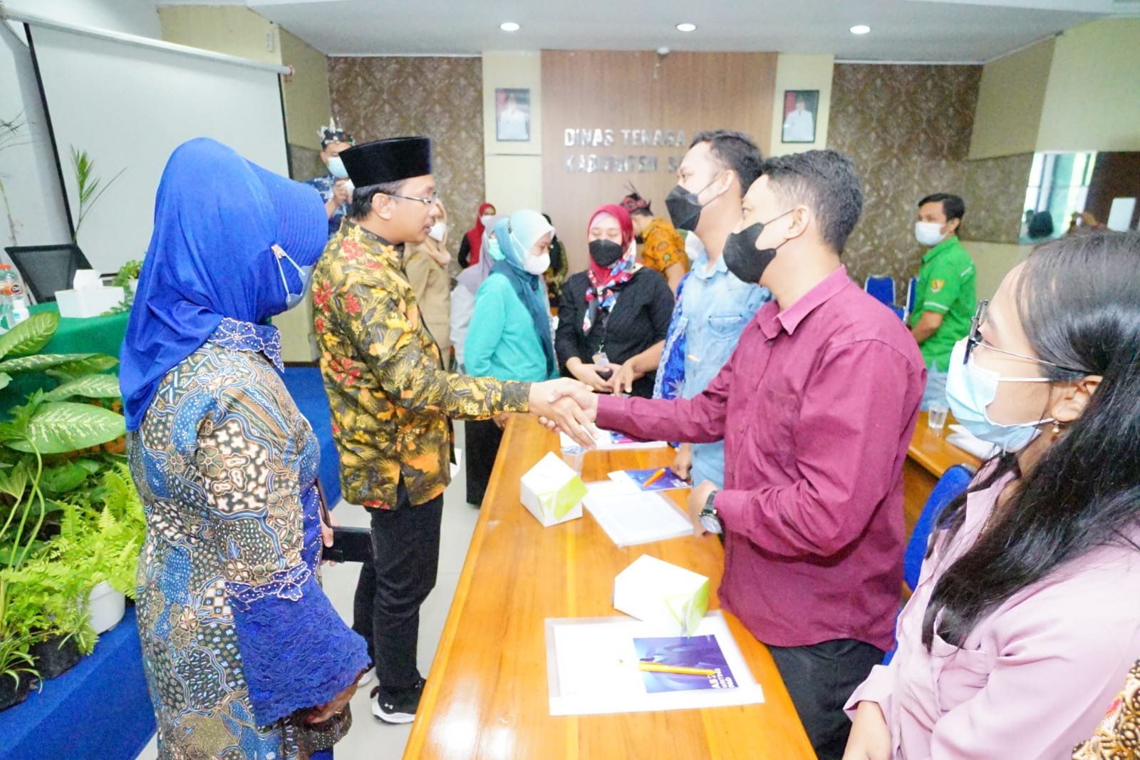 Kepala Dinas Tenaga Kerja Kabupaten Sidoarjo Fenny Apridawati, S.KM, M.Kes serta anggota DPRD Sidoarjo dan perwakilan 30 perusahaan pengurus Serikat Pekerja (SP) dan Serikat Buruh (SB).
