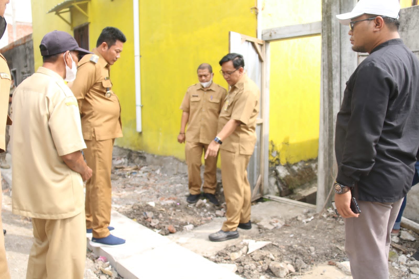 Melihat pengerjaan itu, H. Subandi menyarankan untuk mengukur perbedaan ketinggian dengan waterpass. Tidak menggunakan selang. Dengan alat itu akan mudah diketahui titik rendahnya permukaan. Sehingga fungsi saluran air dapat maksimal. Air hujan dapat seluruhnya mengalir ke saluran air yang dibuat.