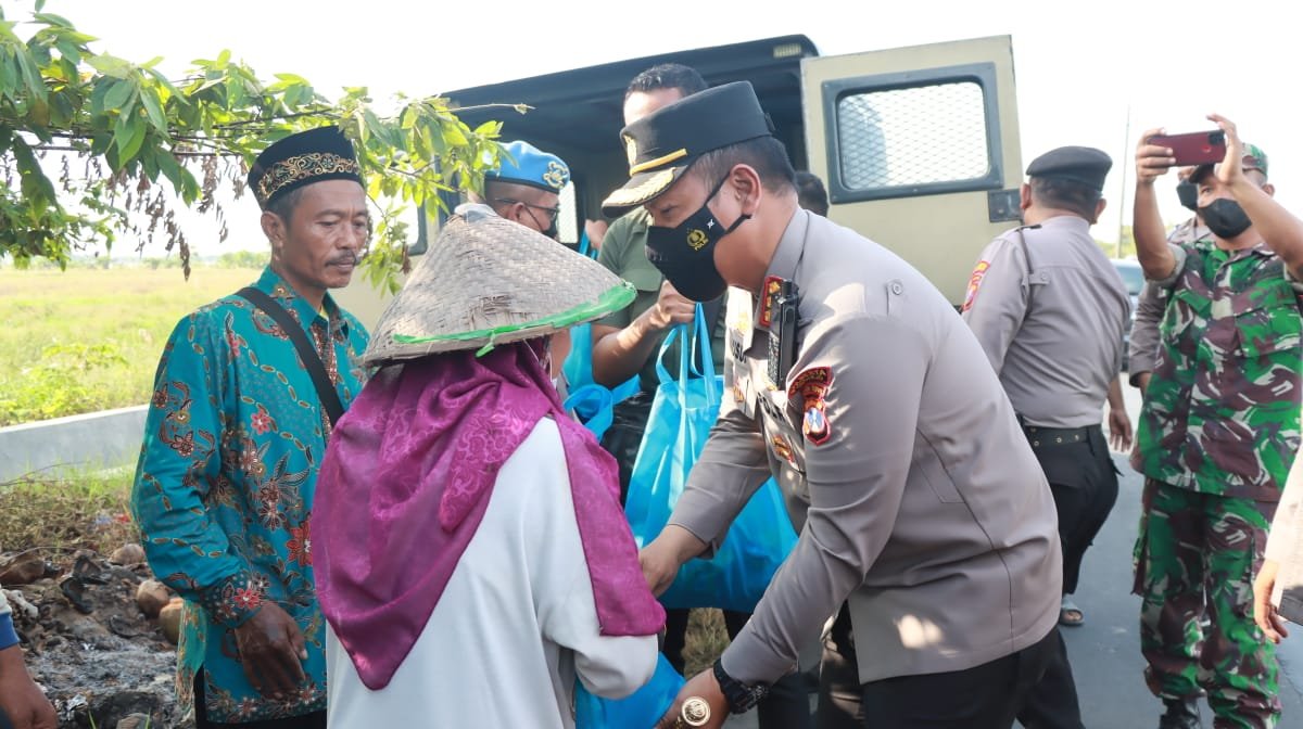 Kali ini dibagikan 300 paket sembako dilakukan langsung Kapolresta Sidoarjo Komisaris Besar Polisi Kusumo Wahyu Bintoro pada para petani di Desa Margosari, Kecamatan Tarik, Kabupaten Sidoarjo, Selasa (13/9/2022).