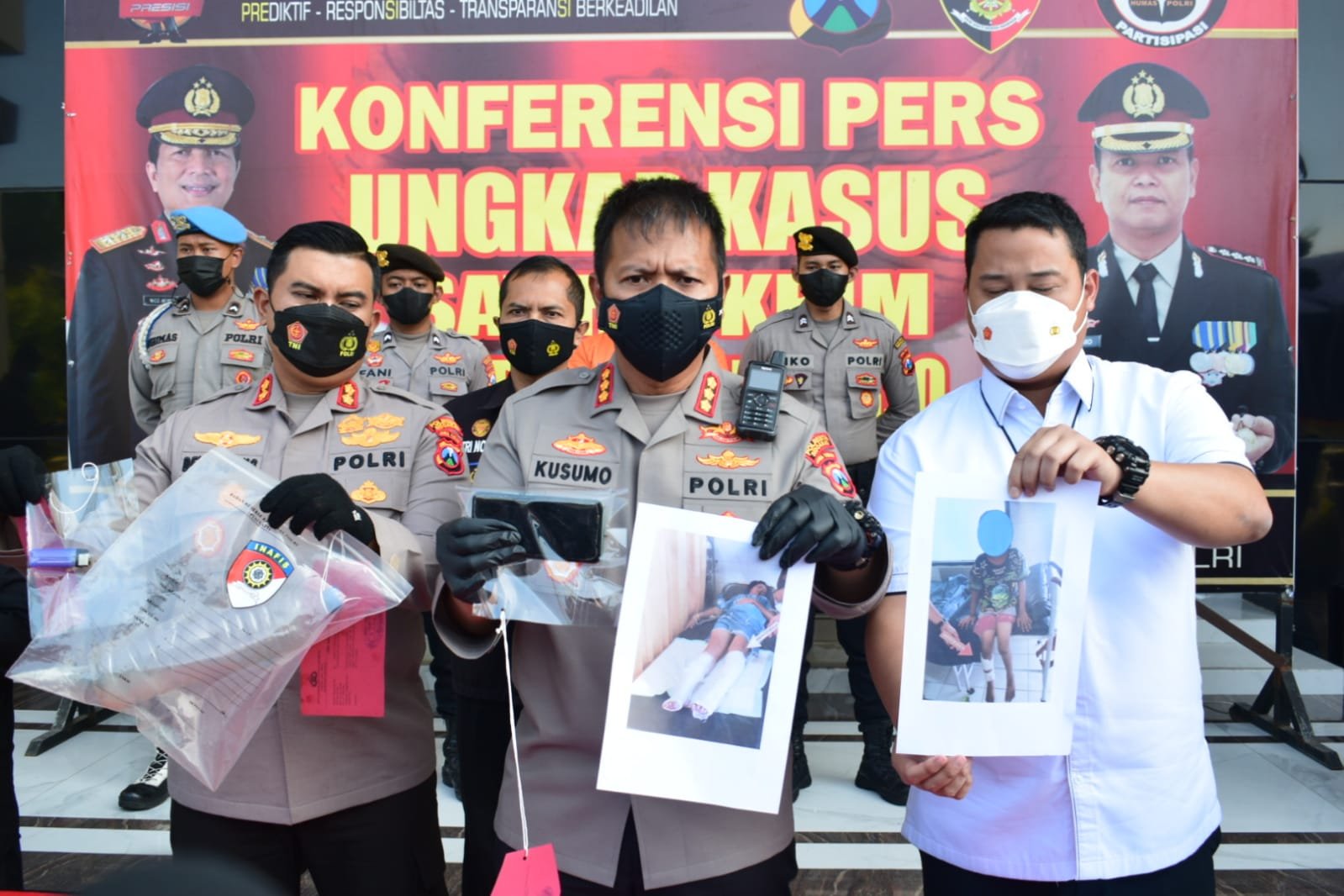 Kapolres Sidoarjo Kombes Pol.Kusumo Wahyu Bintoro,S.H.S.I.K mengungkapkan kasus penganiyaan didepan Mapolresta,Rabu,(14/9/2022),Sebelumnya kedua korban ibu dan anak itu mengalami luka bakar dengan disiram bensin,dalam kejadiannya bahwa tersangka M.T.A menikah siri dengan W.S dan memiliki 2 anak,bahwa sewaktu terjadi pernikahan siri tersebut,W.S dalam status janda dan sudah memiliki 1 anak inisial M.A.P, Kejadian ini dikarenakan tersangka M.T.A Emosi karena istrinya yaitu korban (W.S), Memergoki tersangka saat menonton Video Porno dikamar mandi,selanjutnya terjadi tengkar mulut,akhirnya tersangka mengambil botol berisi bensin dan disiramkan ke punggung dan kaki korban dan disulut dengan tisu yang telah dibakar dengan korek api,” terang Kapolres.