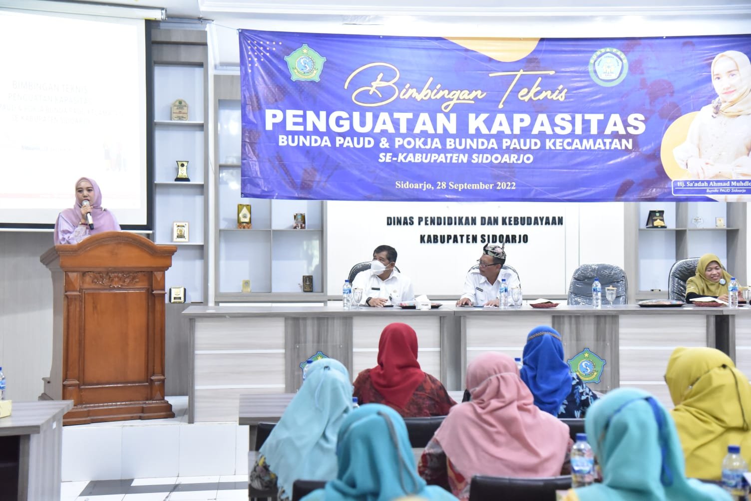 SIDOARJO,majalahglobal.com – Puluhan bunda PAUD kecamatan se Kabupaten Sidoarjo ikuti Bimtek penguatan kapasitas bunda PAUD yang diselenggarakan Pokja Bunda PAUD Kabupaten Sidoarjo, Rabu, (28/9). Kegiatan yang dibuka oleh Bunda PAUD Kabupaten Sidoarjo Hj. Sa’adah Ahmad Muhdlor S.Hum itu digelar aula Dinas Pendidikan dan Kebudayaan Kabupaten Sidoarjo. Kegiatan tersebut juga dihadiri Kepala Dinas Pendidikan dan Kebudayaan Kabupaten Sidoarjo Dr. Tirto Adi M.Pd serta Kepala Dinas P3A KB Kabupaten Sidoarjo drg. Syaf Satriawarman Sp. Pros.
