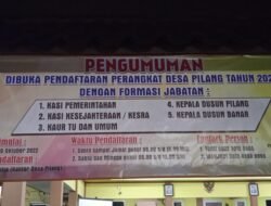 Dan selanjutnya Ketua Panitia membuka pendaftaran perangkat desa pilang tahun 2022,dengan formasi Jabatan yang antara lain Kasi Pemerintahan,Kasi Kesejahteraan /Kesra,Kepala Urusan Tata Usaha dan Umum,Kepala Dusun Pilang,Kepala Dusun Banar, Pendaftarannya dimulai tanggal 16 Oktober 2022 sampai dengan 29 Oktober 2022 , Untuk tempat pendaftarannya di Sekretariat Panitia (Kantor Desa Pilang).dimana ini adalah salah satu wujud keterbukaan publik agar masyarakat Desa Pilang mengetahuinya.