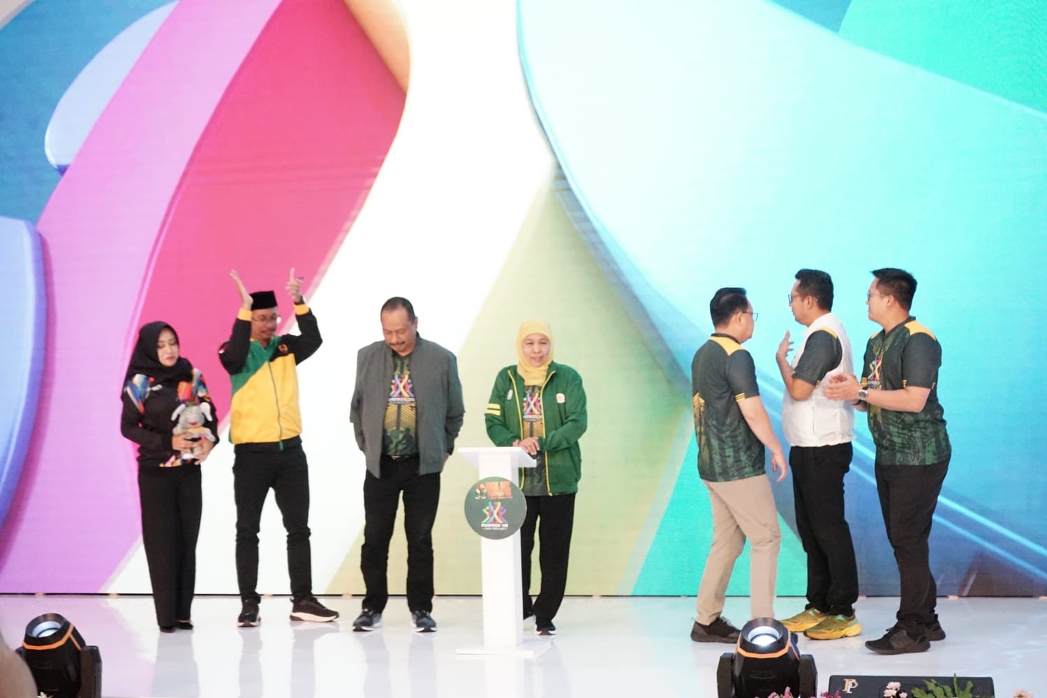 Turut hadir dalam Kick of Maskot Porprov VIII Jatim, Bupati Sidoarjo, Ahmad Muhdlor dan Bupati Mojokerto, Ikfina Fahmawati, dan perwakilan Bupati Jombang.