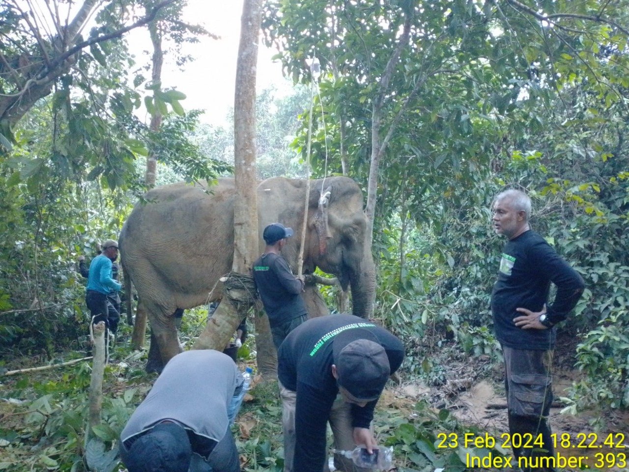 Setibanya di lokasi, satwa yang dilindungi tersebut diketahui dalam keadaan luka-luka di bagian kaki, pinggul dan luka sobek telinga bagian kanan. Belum diketahui penyebabnya, namun diduga luka tersebut akibat perkelahian sesama gajah.