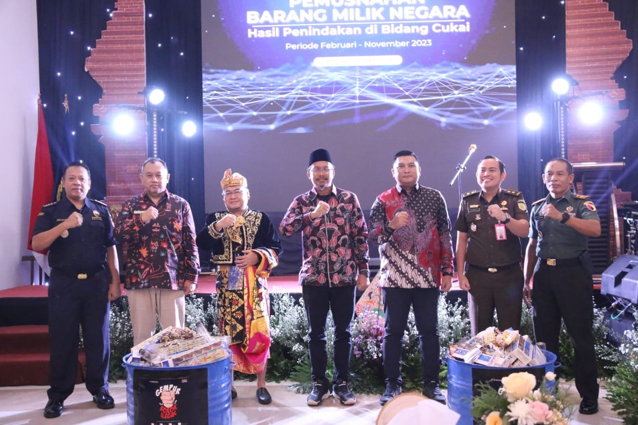Selain menyampaikan komitmen bersama dalam membantu dan mendukung kinerja bea cukai dalam memberantas BKC ilegal Gus Muhdlor bersama Kepala Kantor Bea Cukai, Rudy Hery Kurniawan serta Perwakilan Kejaksaan, Kapolresta, Kodim, Kepala KPKNL, Kakanwil BC, Ka BCSDA, serta Kakanwil Pajak secara simbolis memusnahkan Barang Milik Negara Eks Barang Dikuasai Negara. (Ldy)