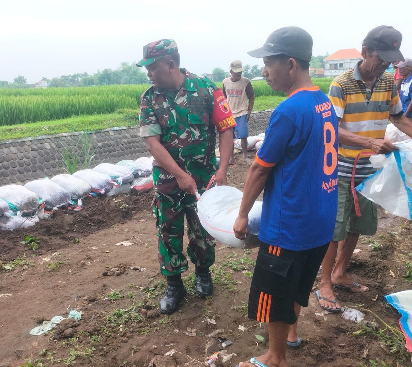 Pantauan di lapangan, tampak Babinsa aktif bersama warga memasukkan material tanah ke dalam karung (sak) disepanjang dinding sungai. (Jay)