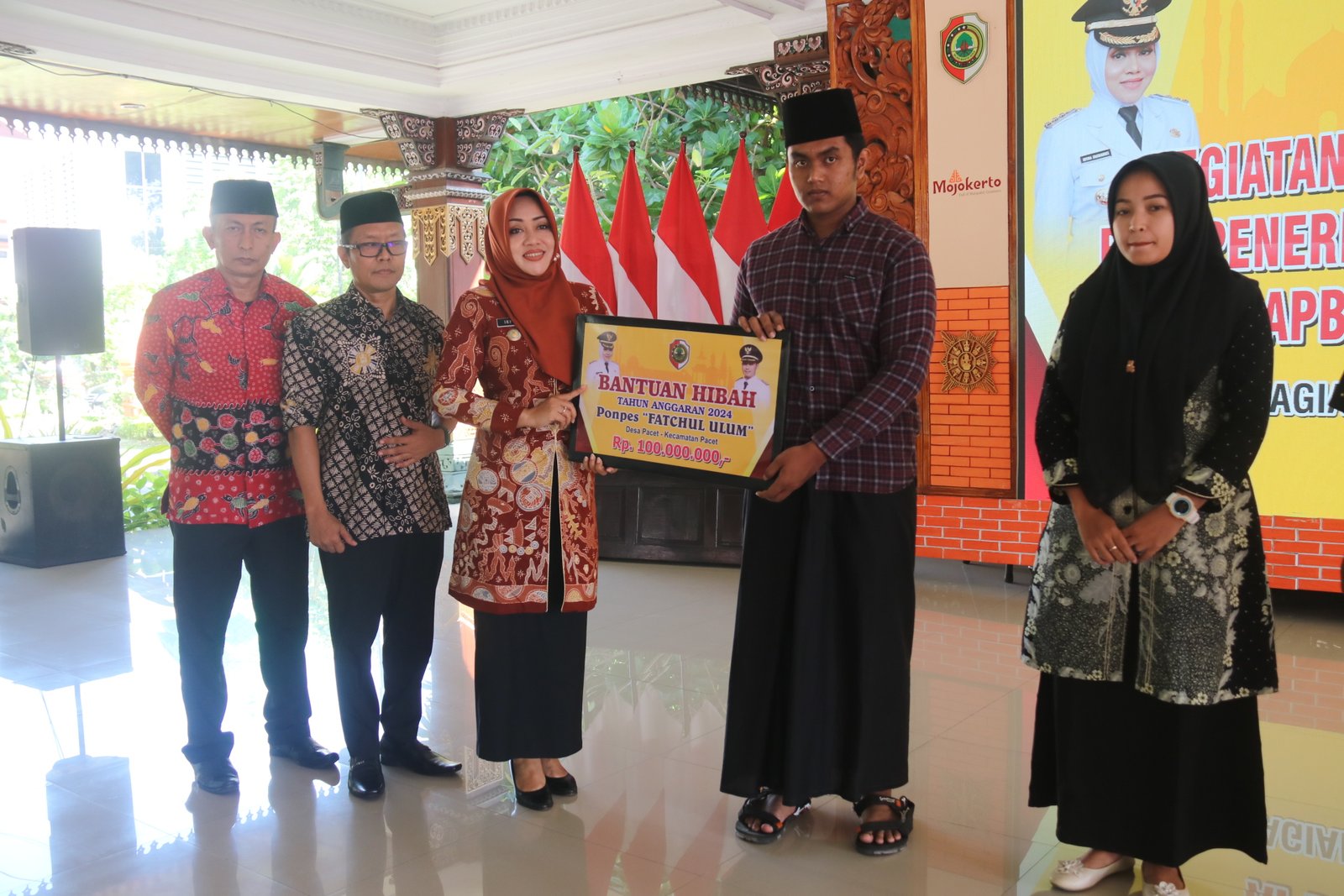 Dalam kesempatan itu, Bupati Mojokerto Ikfina Fahmawati juga menyerahkan bantuan hibah secara simbolis kepada Ponpes Fatchul Ulum, Desa Pacet Kecamatan Pacet menerima bantuan hibah senilai 100 juta, TPQ Al Ijaabah, Desa Pekukuhan, Kecamatan Mojosari menerima bantuan hibah senilai 50 juta, Mushollah Al Basyir, Desa Beloh, Kecamatan Trowulan senilai 50 juta, GKJW Glagahan, Desa Jetis, Kecamatan Jetis menerima 100 juta, serta Masjid Al Hidayah, Desa Kunjorowesi, Kecamatan Ngoro menerima bantuan hibah senilai 100 juta rupiah.