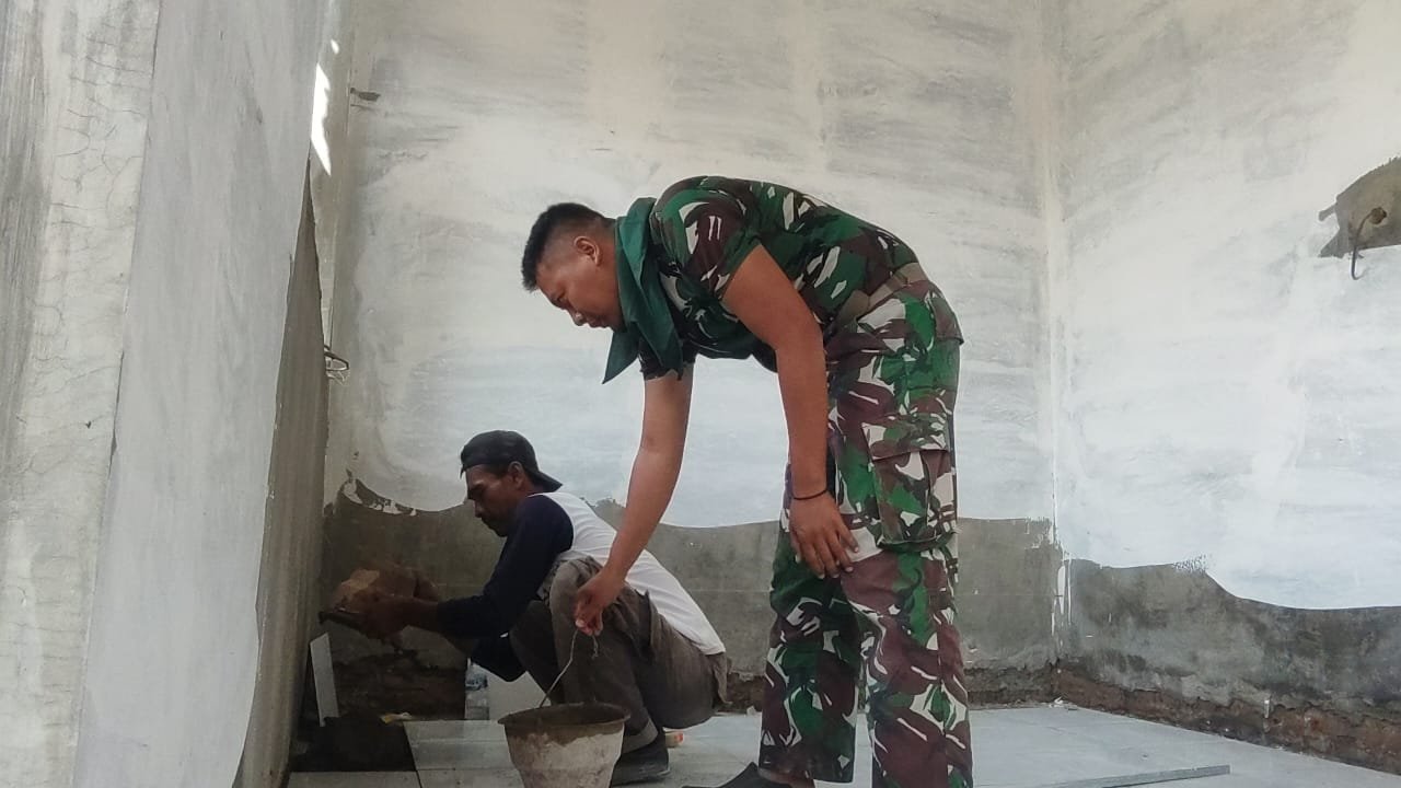 Pantauan di lapangan, tampak pekerjaan yang dilakukan anggota Satgas TMMD bersama masyarakat telah memasuki proses pemelesteran pada dinding tembok dan pemasangan lantai ubin. (Jay)