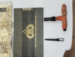Dari tangan tersangka, turut diamankan sepeda motor TVS N27 Nopo B 4235 VT warna Marble Red, sarung pisau badik terbuat dari kayu warna cokelat, 1 set kunci leter “T” dililit dengan kain warna orange, celana Levis panjang warna biru dan baju lengan panjang warna hitam.