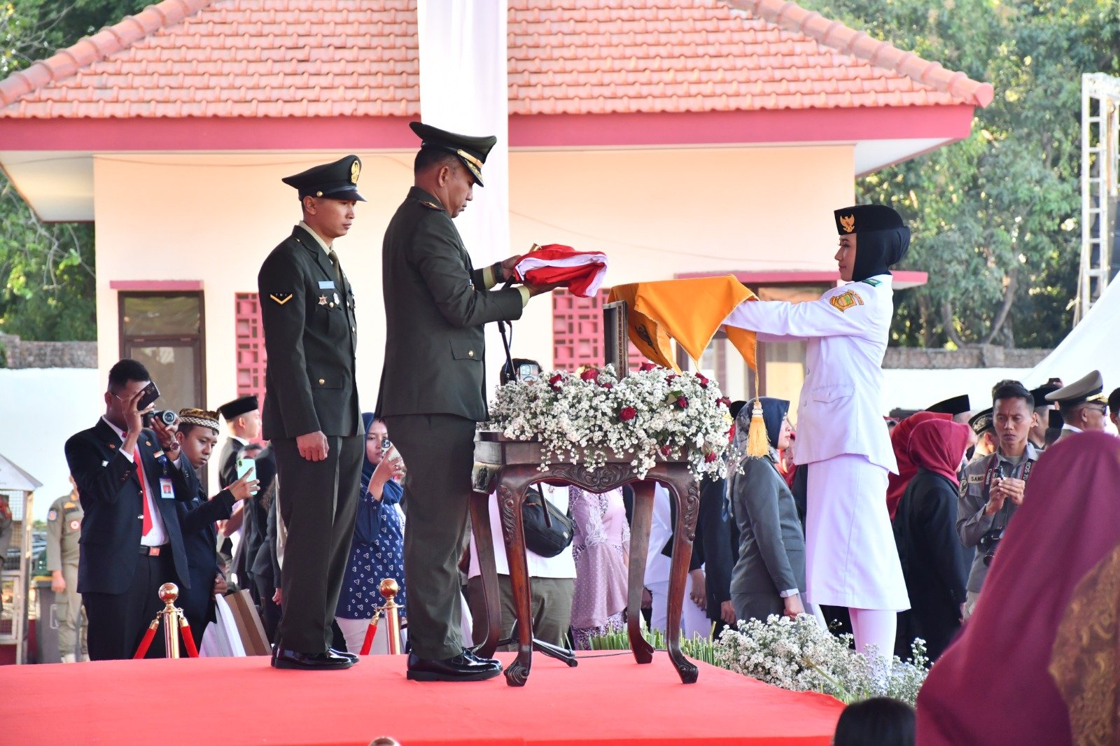 Turut hadir undangan pada upacara penurunan bendera merah putih tersebut, Danrem 082 CPYJ diwakili Kasi Ops Kasrem 082/CPYJ, Mayor Kav Surya Haadi beserta ibu, Pj. Walikota Mojokerto, M. Ali Kuncoro, S.STP., M.Si., beserta ibu, Kapolres Kota Mojokerto, AKBP Daniel Somanonasa Marunduri, S.I.K., M.H., beserta ibu, Kajari Kota Mojokerto, Ketua PN Mojokerto, Sekdakot Gaguk Tri Prasetyo, ATD., M.M, beserta ibu, para Asisten Setda Kota Mojokerto, Ka OPD Kota Mojokerto, para Veteran, Camat dan Lurah se-Kota Mojokerto, tokoh agama, tokoh masyarakat dan undangan lainnya.
