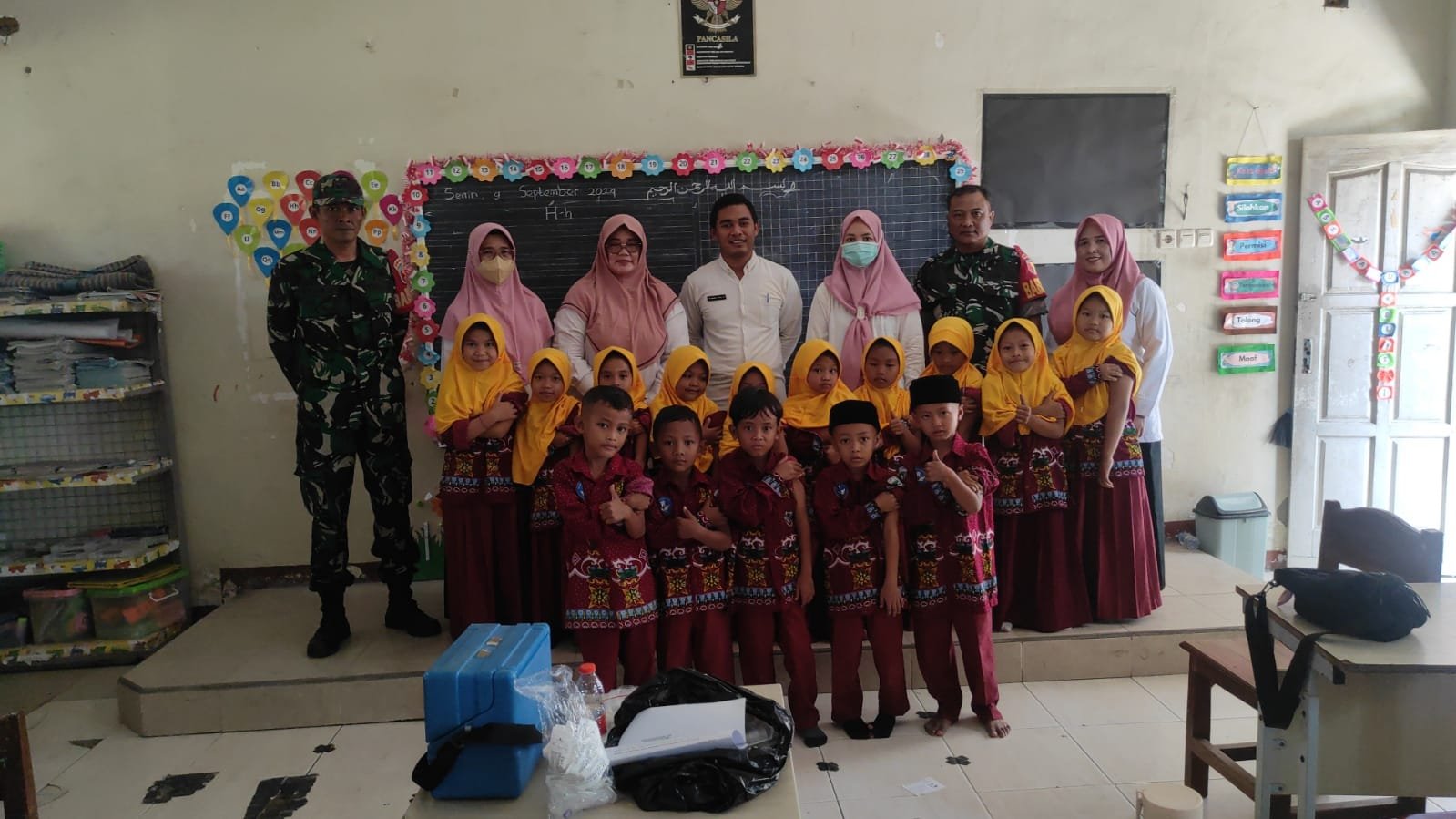 Mojokerto, – Babinsa Mojodadi Koramil 0815/06 Kemlagi Kodim 0815/Mojokerto Serka Kartono melaksanakan kegiatan pendampingan Nakes dalam kegiatan Bulan Imunisasi Anak Sekolah (BIAS) di SDN Mojodadi, Desa Mojodadi, Kecamatan Kemlagi, Kabupaten Mojokerto, Jawa Timur, (11/09/2024).