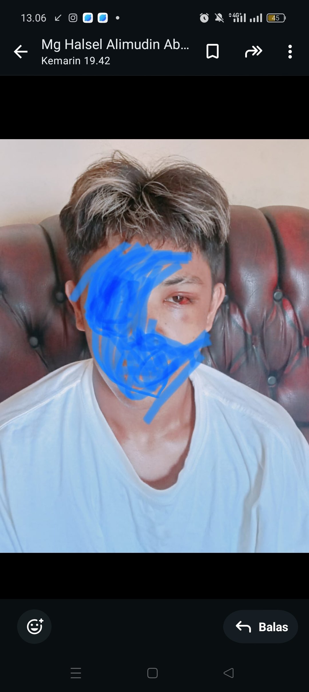 Rian dia pukul pa saya pe dalam muka saya langsung jatong,, bagitu saya jatong langsung Rian deng depe tamang tamang borong (koroyok) pa saya,,saya tara tau kalu saya pe mata so kaluar dara karna saya tara sadar,,bagitu saya sadar turus darah kaluar dari mata baru saya kage bahwa saya pe mata luka..jelas nya