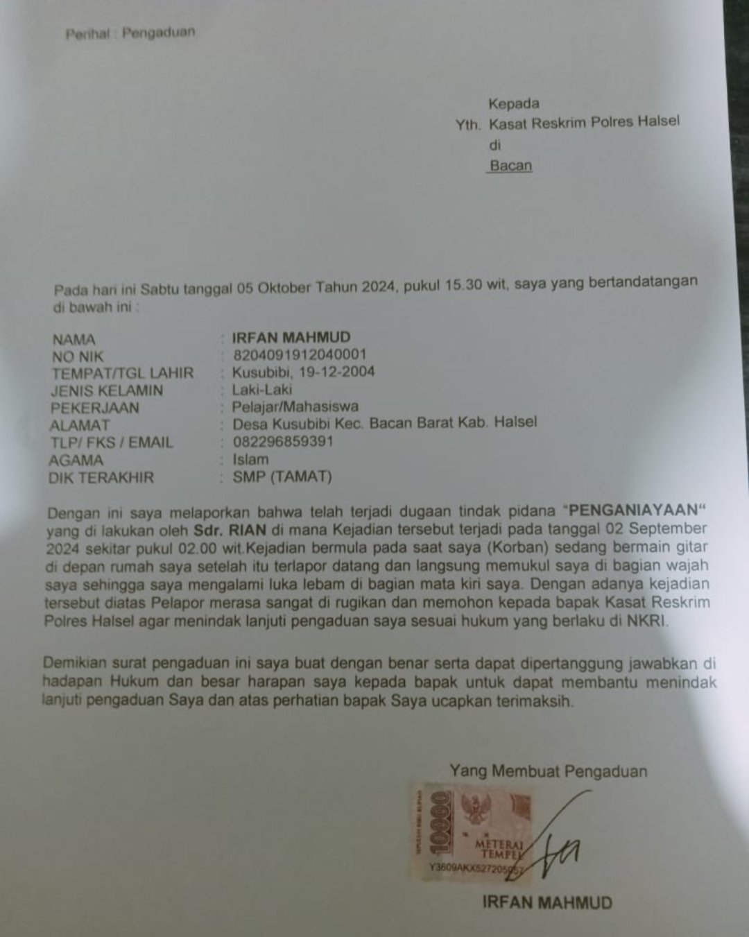 Salah seorang korban Irfan Mahmud,,kepada media mengatakan,,soal kasus dugaan tindak pidana penganiyayaan ini atas permintaan korban,,dengan niat baik awalnya korban melakukan pengaduan di SPKT polres halsel dengan tujuan untuk memediasi antra kedua bela pihak,,tetapi pelaku (RIAN) pun tidak mengindahkan undangan dari SPKT polres halsel,,sebanyak dua kali,,maka korban pun,tanpa belas kadihan langsung membuat laporan secara resami dan akan di tindak lanjuti di Reskrim polres halsel.
