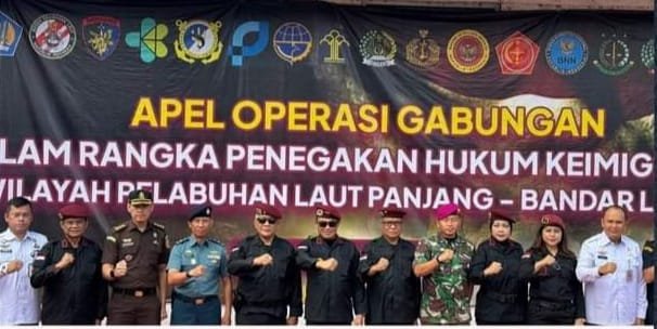 LAMPUNG, majalahglobal.com – Kepala Kantor Wilayah Kementrian Hukum dan HAM Lampung,Dodot Adikoeswanto Memimpin Apel dalam Rangka Operasi Gabungan Laut Tim Pengawasan Orang Asing di Pelabuhan Panjang.Operasi Gabungan yang dihadiri Kepala Divisi Keimigrasian,Tato Juliadin Hidayawan bersama Jajaran Keimigrasian dan Pemasyarakatan Provinsi Lampung ; juga di hadiri PT.Pelni Regional 2 Panjang Kesyahbandaran dan Otoritas Pelabuhan Kelas I Panjang; Bea dan Cukai Bandar Lampung; BKK Kelas I Panjang; Lanal Lampung; BAIS TNI Lampung; KSKP; Polsek Panjang,Rabu(23/10/2024).