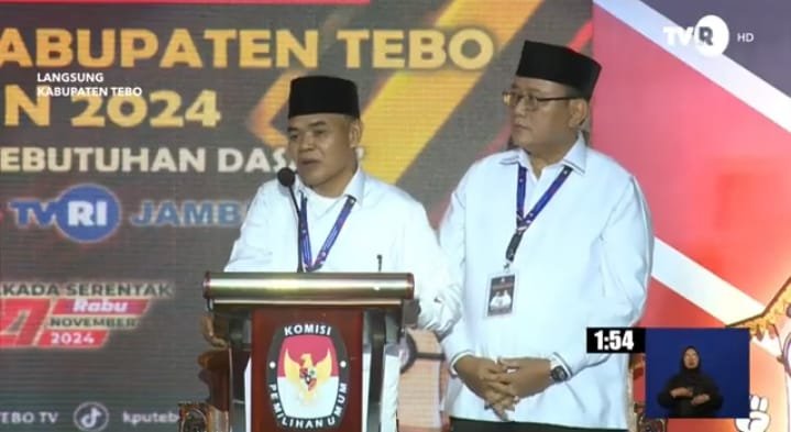 TEBO – Pasangan Calon Bupati dan Wakil Bupati Tebo nomor urut 1, H Aspan – Wartono Triyan Kusumo atau Aston, tampil prima dan penuh percaya diri serta mengesankan dalam Debat Publik Perdana Pemilihan Bupati dan Wakil Bupati Kabupaten Tebo pemilihan serentak tahun 2024 yang digelar oleh KPU Kabupaten Tebo, pada Kamis malam (31/10/20240 di Aula utama kantor DPRD Kabupaten Tebo.
