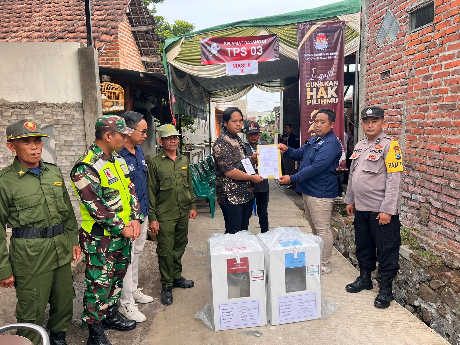 Mojokerto – Koramil 0815/16 Pacet Kodim 0815/Mojokerto mengerahkan seluruh Babinsa bareng Polsek melakukan pengawalan pendistribusian logistik Pilkada dari gudang Panitia Pemungutan Suara (PPS) ditingkat desa menuju Tempat Pemungutan Suara (TPS) di wilayah Kecamatan Pacet, Kabupaten Mojokerto, Jawa Timur, Selasa (27/11/2024).