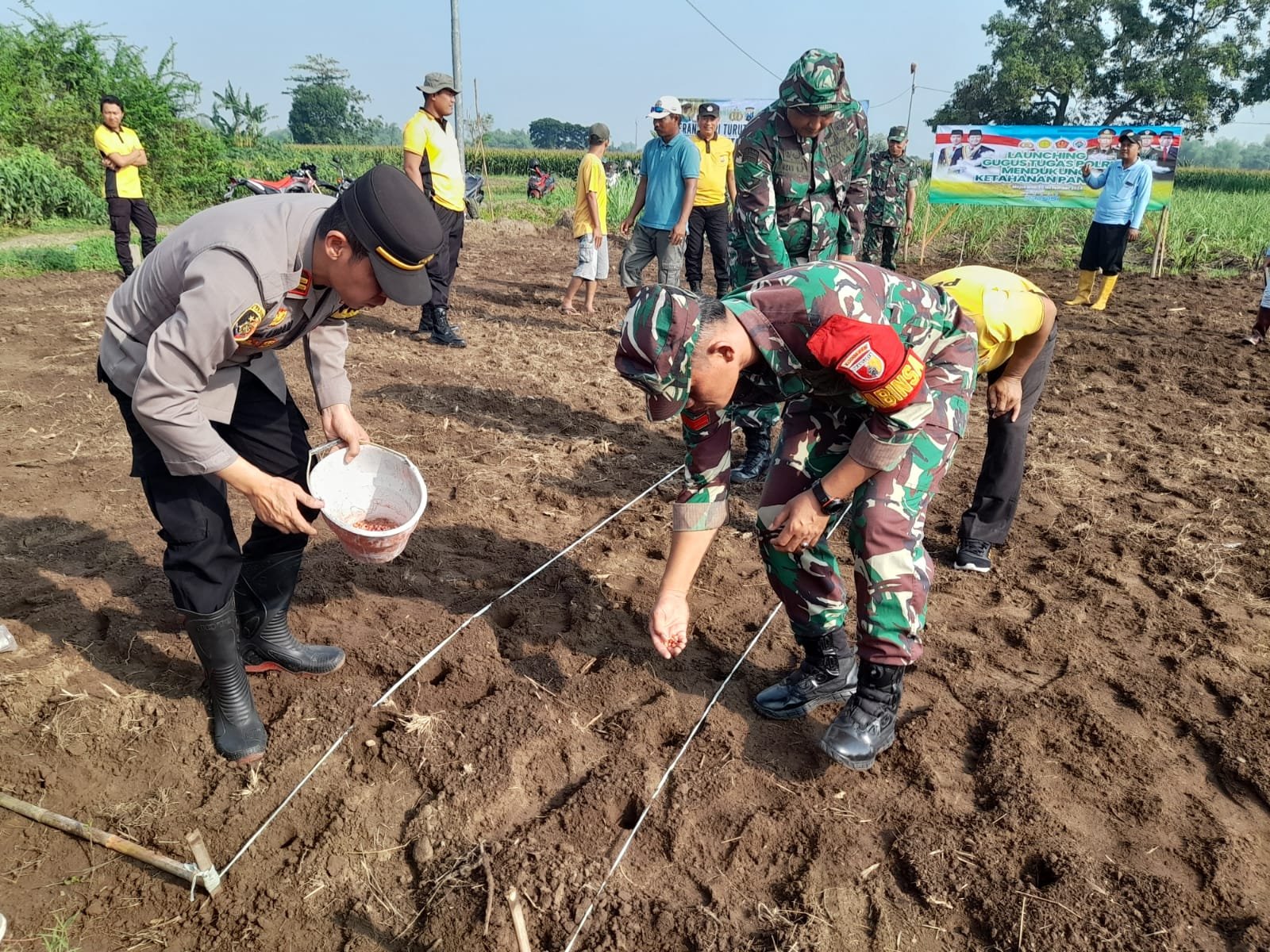 Mojokerto – Polsek Dlanggu Polres Mojokerto Polda Jatim bersama Forkopimca dlanggu dan BPP serta Gapoktan melaksanakan penanaman jagung dilahan tidur dan dimanfaatkan menjadi pertanian di Lahan Persawahan, Dusun Selorejo, Desa Sumbersono, Kecamatan Dlanggu, Kabupaten Mojokerto, Jum’at (22/11/24).
